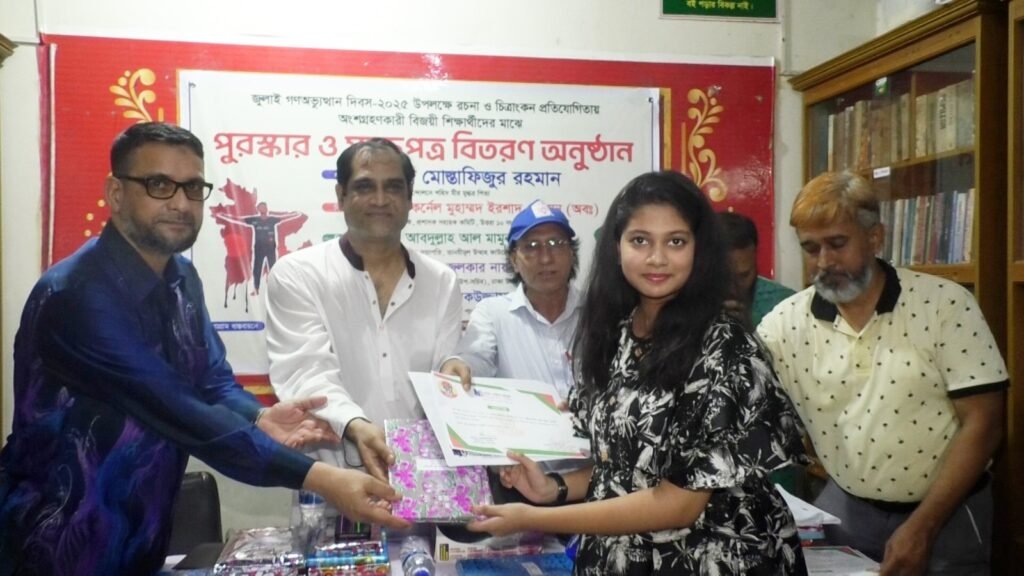 উত্তরা পাবলিক লাইব্রেরি আয়োজিত ‘জুলাই গণঅভ্যুত্থান দিবস-২০২৫ রচনা ও চিত্রাঙ্কন প্রতিযোগিতা’য় বিজয়ী ২৬ অংশগ্রহণকারীর হাতে পুরস্কার তুলে দেয়া হয়েছে।