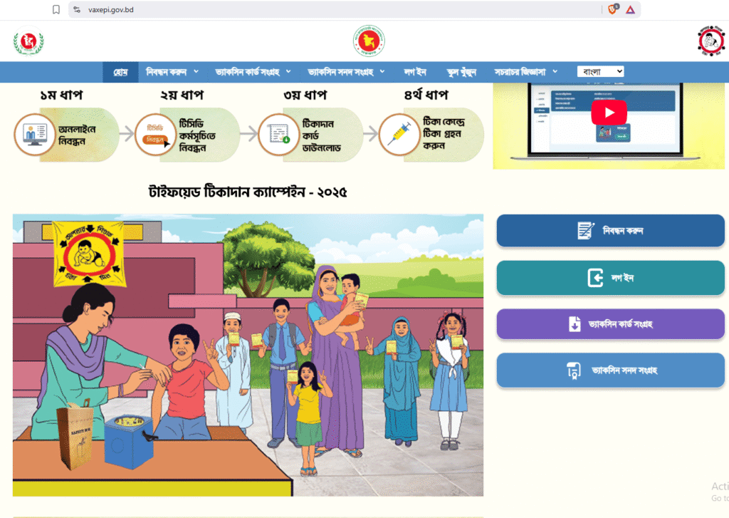 টিকাপ্রাপ্তি নিশ্চিত করার লক্ষ্যে উদ্দিষ্ট সকল শিক্ষার্থী এবং শিশুদের https://vaxepi.gov.bd ওয়েবসাইটে জন্ম নিবন্ধন সনদের ১৭ সংখ্যা দিয়ে রেজিস্ট্রেশন করুন। পরবর্তীতে ঐ একই ওয়েবসাইট থেকে টাইফয়েড টিকাদান কার্ড ডাউনলোড করে টিকাদানের দিন নিয়ে আসুন।
