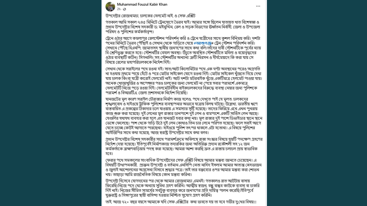 ‘ট্রেনে ওঠার আগে কমলাপুর রেলস্টেশন পরিদর্শন করি ও ট্রেনে যাত্রীদের সঙ্গে কুশল বিনিময় করি। দশটা পনের মিনিটে ভৈরব পৌঁছাই ও সেখান থেকে গাড়িতে গিয়ে “আশুগঞ্জ” ট্রেন স্টেশন পরিদর্শন করি। সেখানে পৌঁছে বিএনপি, জামায়াতসহ স্থানীয় জনগণের সঙ্গে কথা বলি। তাদের দাবি স্টেশনটিকে পূর্বের ন্যায় বি-শ্রেণিভুক্ত করতে হবে। স্টেশনটির বেহাল অবস্থা। উঁচুতে অবস্থিত স্টেশনটিতে নারী ও বয়োবৃদ্ধদের ওঠার ব্যবস্থা কঠিন। সিগন্যালিংসহ স্টেশনটির অন্যান্য ত্রুটি নিরসন ও দীর্ঘমেয়াদে কী করা যায় সে বিষয়ে রেলের মহাপরিচালককে নির্দেশ দিই,’ বলেও লিখেন তিনি।মোটরসাইকেল চালকের হেলমেট না থাকা প্রসঙ্গে তিনি লিখেন, ‘সেখান থেকে সরাইলের পথে রওনা হই। সাত/আট কিলোমিটার পথে এক ঘণ্টা অবস্থানের পরেও অগ্রগতি না হওয়ায় প্রথমে পায়ে হেঁটে ও পরে মোটরসাইকেলযোগে রওনা দিই। মোটরসাইকেল খুঁজতে গিয়ে দেখা যায়, চালক কিংবা যাত্রী কারোরই হেলমেট নাই। আট-দশটা মোটরবাইক খুঁজে একটিমাত্র হেলমেট পাওয়া যায়। অনেক খোঁজাখুঁজি ও অপেক্ষার পরও চালকের জন্য হেলমেট না পেয়ে সবার পরামর্শে একমাত্র হেলমেটটি নিজে পরে রওনা দেই। হেলমেটবিহীন বাইকচালকদের বিরুদ্ধে ব্যবস্থা নেওয়ার জন্য পুলিশকে পরামর্শ ও বিআরটিএ, জেলা প্রশাসনকে নির্দেশ দিয়েছি।’