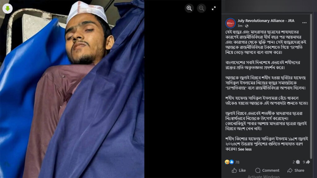 জুলাই আন্দোলনে রাজধানীর উত্তরায় পুলিশের গুলিতে শাহাদাত বরণ করেন শহীদ কিশোর হাফেজ সাদিকুল ইসলাম।