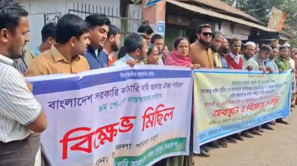 নেত্রকোনার দুর্গাপুর উপজেলার সকল সরকারি দপ্তরের কর্মচারীদের সমন্বয়ে নবম জাতীয় পে-স্কেল ঘোষনার দাবিতে এক বিক্ষোভ